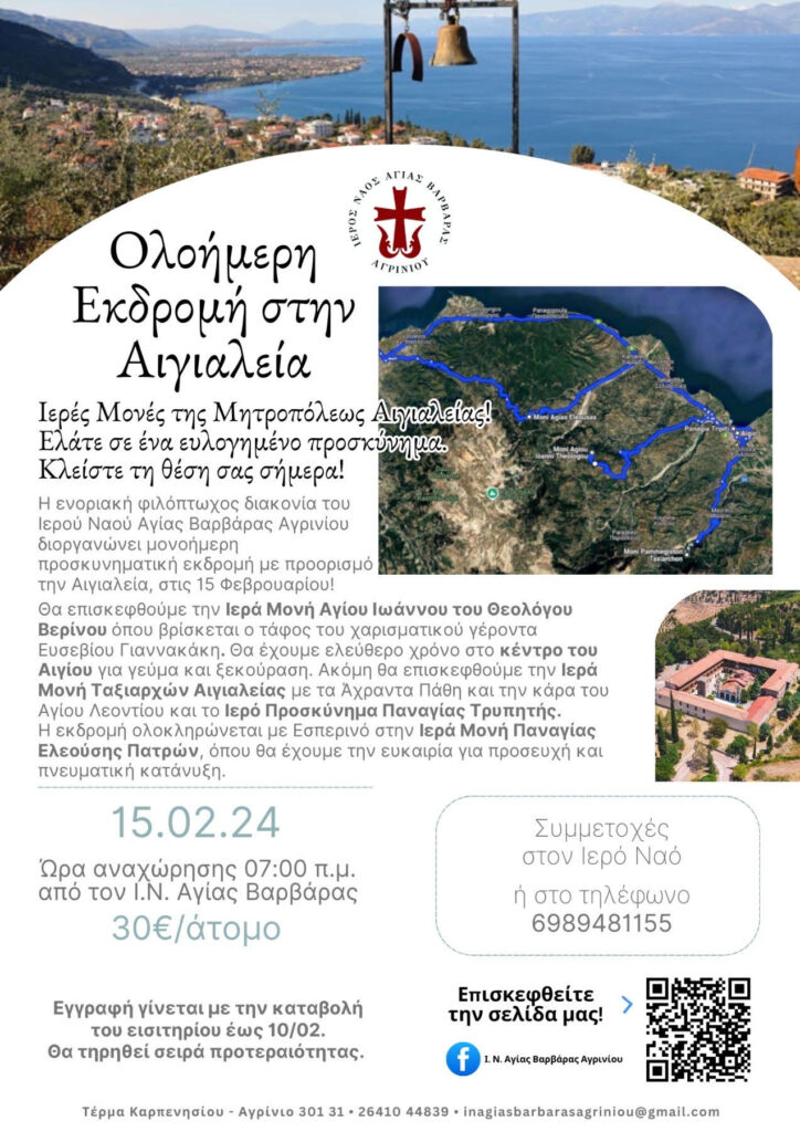 Σας προσκαλούμε σε μια προσκυνηματική εκδρομή, όπου θα επισκεφθούμε σημαντικές Ιερές Μονές και Ιερά Προσκυνήματα της Μητροπόλεως Αιγιαλείας, βιώνοντας στιγμές πνευματικής ανάτασης και ευλογίας. Πρόγραμμα Εκδρομής: Ιερά Μονή Αγίου Ιωάννου του Θεολόγου Βερίνου Πρώτος σταθμός μας είναι η Ιερά Μονή Αγίου Ιωάννου του Θεολόγου στο Βερίνο, όπου βρίσκεται ο τάφος του χαρισματικού γέροντα, πατρός Ευσεβίου Γιαννακάκη. Ελεύθερος χρόνος για γεύμα στο κέντρο του Αιγίου Απολαύστε το γεύμα σας σε μια από τις παραδοσιακές ταβέρνες ή τα καφέ της όμορφης πόλης. Ιερά Μονή Ταξιαρχών Αιγιαλείας Συνεχίζουμε με την επίσκεψή μας στην ιστορική Ιερά Μονή Ταξιαρχών, όπου φυλάσσονται τα Άχραντα Πάθη του Κυρίου και η κάρα του Αγίου Λεοντίου. Ιερό Προσκύνημα Παναγίας Τρυπητής Αιγίου Επόμενος σταθμός μας είναι το θαυματουργό Ιερό Προσκύνημα της Παναγίας Τρυπητής, ένα από τα σημαντικότερα πνευματικά κέντρα της περιοχής. Ιερά Μονή Παναγίας Ελεούσης Πατρών Η εκδρομή ολοκληρώνεται με την ακολουθία του Εσπερινού στην Ιερά Μονή Παναγίας Ελεούσης, όπου θα έχουμε την ευκαιρία για προσευχή. Μια προσκυνηματική εμπειρία γεμάτη ευλογία μας περιμένει!