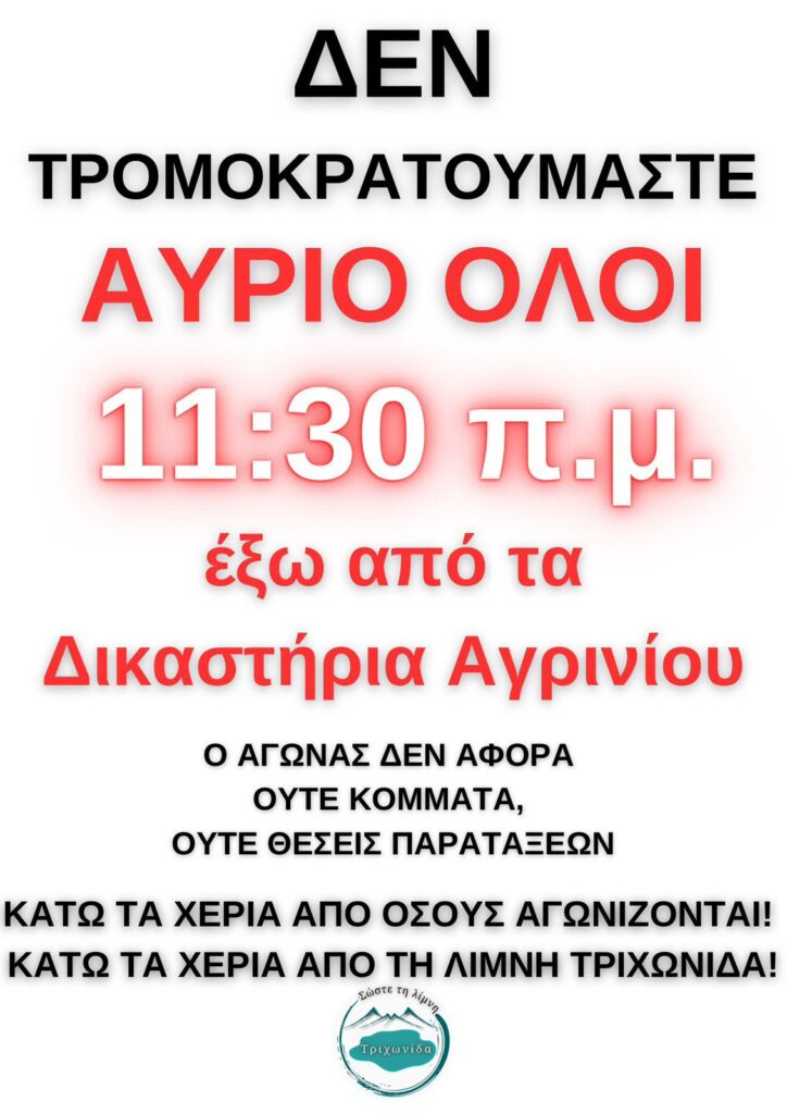 ΟΛΕΣ/ΟΙ ΑΥΡΙΟ ΣΤΙΣ 11:30π.μ. ΣΤΗ ΣΥΓΚΕΝΤΡΩΣΗ ΔΙΑΜΑΡΤΥΡΙΑΣ ΣΤΑ ΔΙΚΑΣΤΗΡΙΑ ΑΓΡΙΝΙΟΥ!