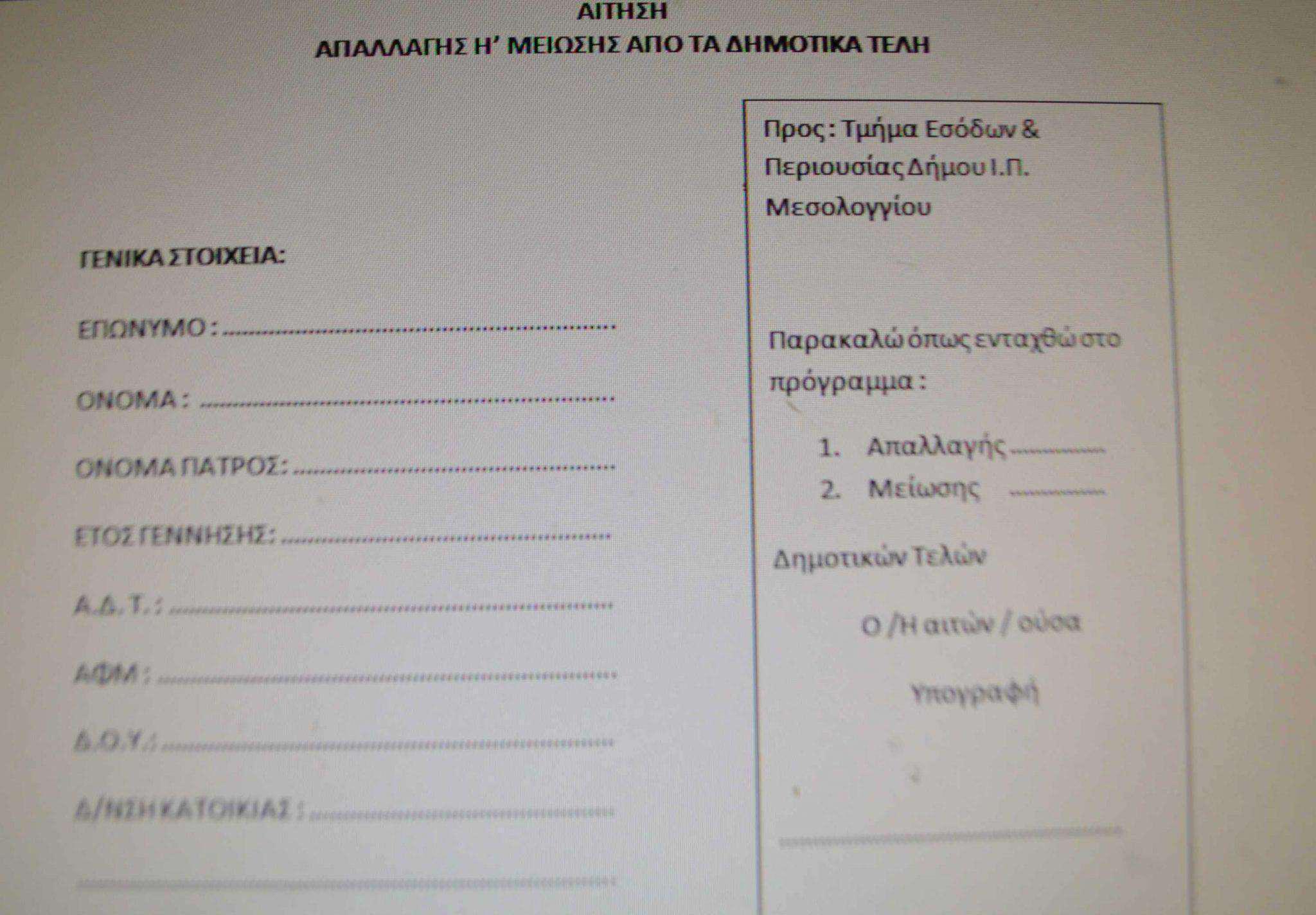 Έως την 10η Φεβρουαρίου 2017 οι ενδιαφερόμενοι δημότες Δ. Ιερής Πόλης Μεσολογγίου μπορούν να προσέρχονται στο Τμήμα Εσόδων και Περιουσίας, προκειμένου να υποβάλλουν τα απαραίτητα δικαιολογητικά και την αίτηση για μειώσεις και απαλλαγές από τα δημοτικά τέλη.