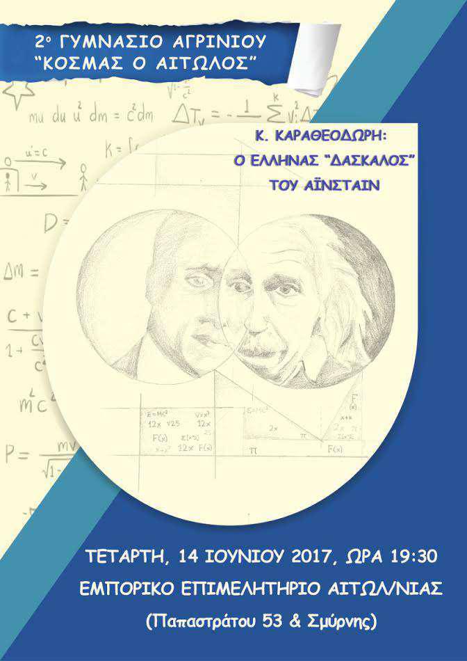 Στο πλαίσιο του πολιτιστικού προγράμματος «Κων. Καραθεοδωρή: ο έλληνας δάσκαλος του Αϊνστάιν» που υλοποιήθηκε τη φετινή χρονιά στο 2ο Γυμνάσιο Αγρινίου «Κοσμάς ο Αιτωλός», διοργανώνεται την Τετάρτη 14 Ιουνίου και ώρα 19:30, στο Εμπορικό Επιμελητήριο μια εκδήλωση προς τιμήν του Κ. Καραθεοδωρή. Επιπλέον, στην εκδήλωση θα συμμετάσχει το τμήμα παραδοσιακής μουσικής του Δ. Αγρινίου.