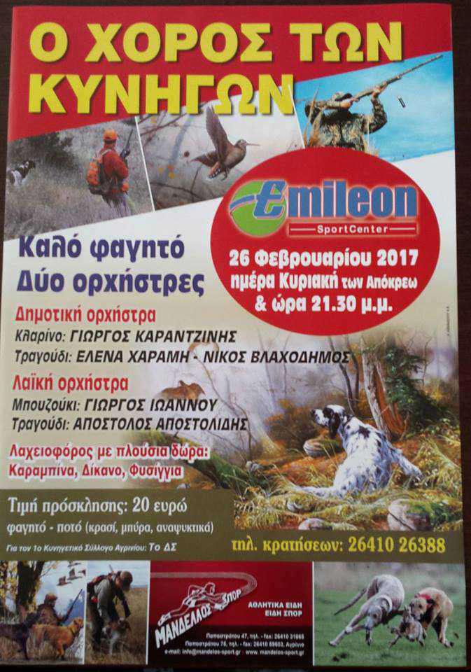 Ο χορός των κυνηγών θα πραγματοποιηθεί την Κυριακή 26 Φεβρουαρίου στο Emileon και περιλαμβάνει διασκέδαση με δημοτική και λαϊκή ορχήστρα. καλό φαγητό και λαχειοφόρο με πλούσια δώρα!