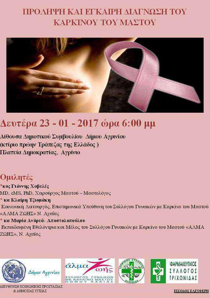 - Η Διεύθυνση Κοινωνικής Προστασίας & Δημόσιας Υγείας του Δήμου Αγρινίου, ο Ιατρικός Σύλλογος Αγρινίου και ο Φαρμακευτικός Σύλλογος Τριχωνίδας σε συνεργασία με το Σύλλογο Γυναικών με Καρκίνο Μαστού « Άλμα Ζωής» Ν. Αχαΐας πραγματοποιούν Ενημερωτική Εκδήλωση με θέμα: