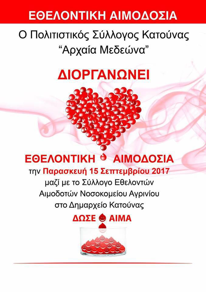 Αιμοδοσία 15/9 από τον Πολιτιστικό ΣύλλογοΚατούνας ”Αρχαία Μεδεώνα”