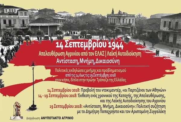 Το Ανυπότακτο Αγρίνιο τιμώντας και φέτος την 14η Σεπτεμβρίου του 1944, ημέρα της απελευθέρωσης του Αγρινίου από τον ΕΛΑΣ, καθώς και τη λειτουργία, αμέσως μετά, του 1ου Λαϊκού Δημοτικού Συμβουλίου, πραγματοποιεί μια σειρά από εκδηλώσεις με το γενικό τίτλο: «Αντίσταση, Μνήμη, Δικαιοσύνη». Οι εκδηλώσεις αυτές θα πραγματοποιηθούν, στον κήπο της Tράπεζας της Ελλάδας από τις 14 έως τις 19 Σεπτεμβρίου 2018.