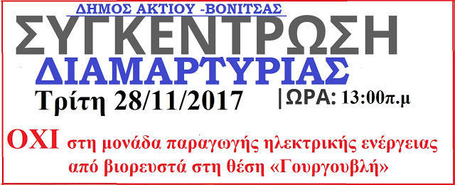 Ύστερα από συνάντηση που είχε ο Δήμαρχος Ακτίου-Βόνιτσας με τα προεδρεία των τοπικών κοινοτήτων, Δρυμού, Θυρρείου και Παλιαμπέλων αποφασίστηκε στις 28/11/2017 ημέρα Τρίτη και ώρα 13:00π.μ να κλείσει ο δρόμος  ως ένδειξη διαμαρτυρίας για τη μονάδα παραγωγής ηλεκτρικής ενέργειας από βιορευστά στη θέση «Γουργουβλή» και καλούμε όλους τους φορείς και τους κατοίκους όπως συμμετέχουν.