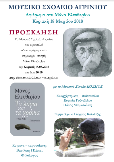 Μελοποιημένη ποίηση θα αποδώσουν και θα ερμηνεύσουν ο Γιάννης Λεκόπουλος στο τραγούδι και η συνθέτρια Αρετή Κοκκίνου, στην κιθάρα και στα φωνητικά.