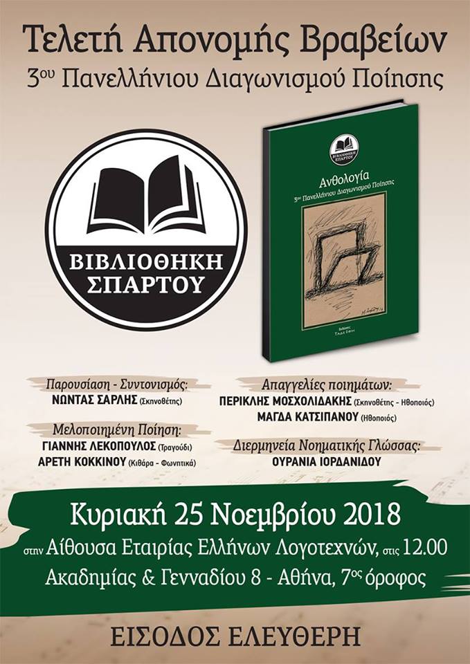Η Βιβλιοθήκη Σπάρτου διοργανώνει εκδήλωση για να τιμήσει τους βραβευθέντες και διακριθέντες του 3ου Πανελλήνιου Διαγωνισμού Ποίησης.