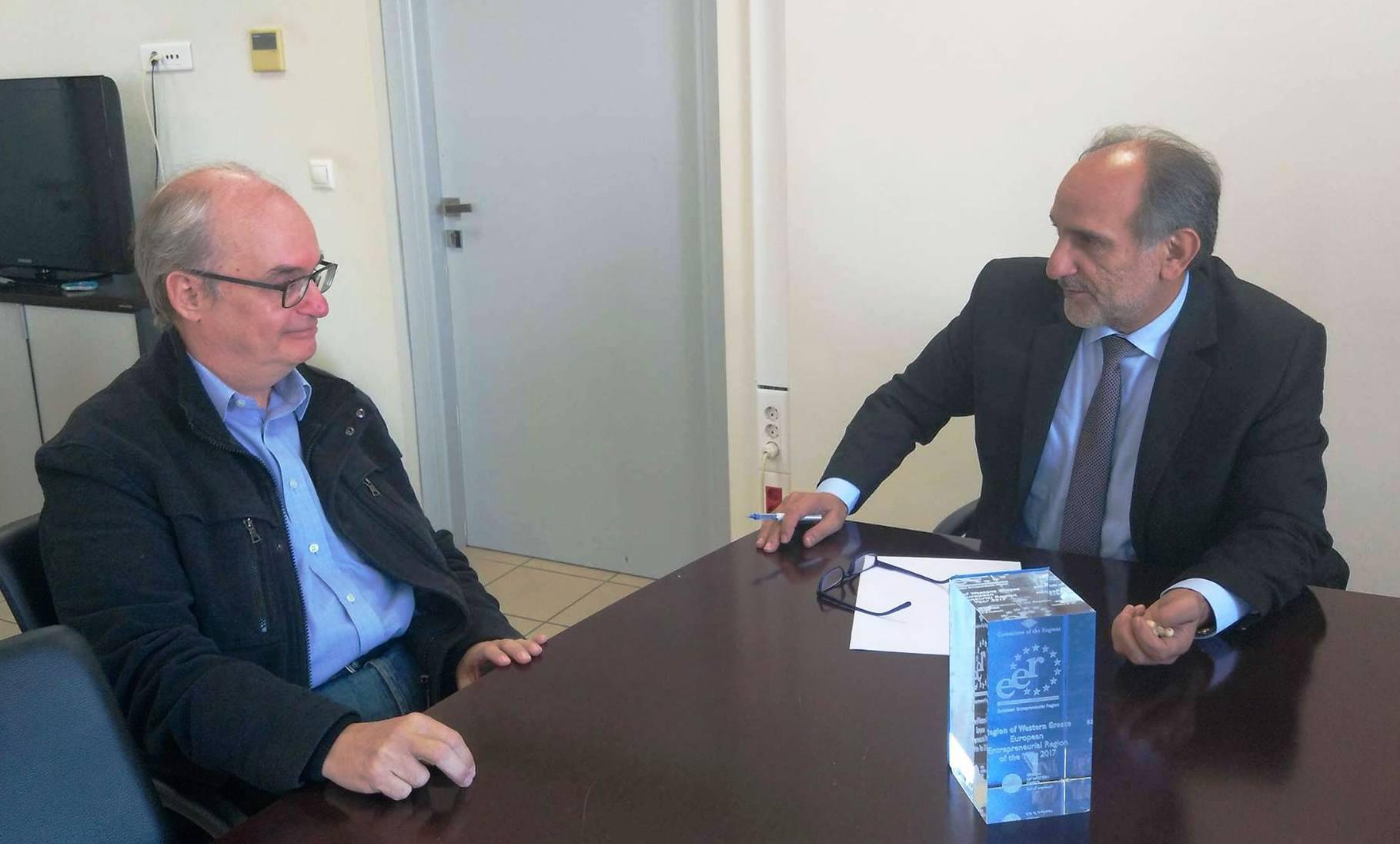 Τα ζητήματα που αφορούν την Βιομηχανική Περιοχή της Πάτρας, αλλά και τα εκτελούμενα, ή υπό εκτέλεση έργα της Περιφέρειας Δυτικής Ελλάδας συζήτησαν σήμερα Τετάρτη 22 Νοεμβρίου 2017 ο Περιφερειάρχης Απόστολος Κατσιφάρας με τον Πρόεδρο του Συνδέσμου Επιχειρήσεων Βιομηχανικής Περιοχής Πατρών και Πρόεδρο του Συνδέσμου Πτυχιούχων Εργοδηγών Δημοσίων Έργων Αχαΐας Πέτρο Μαντά.