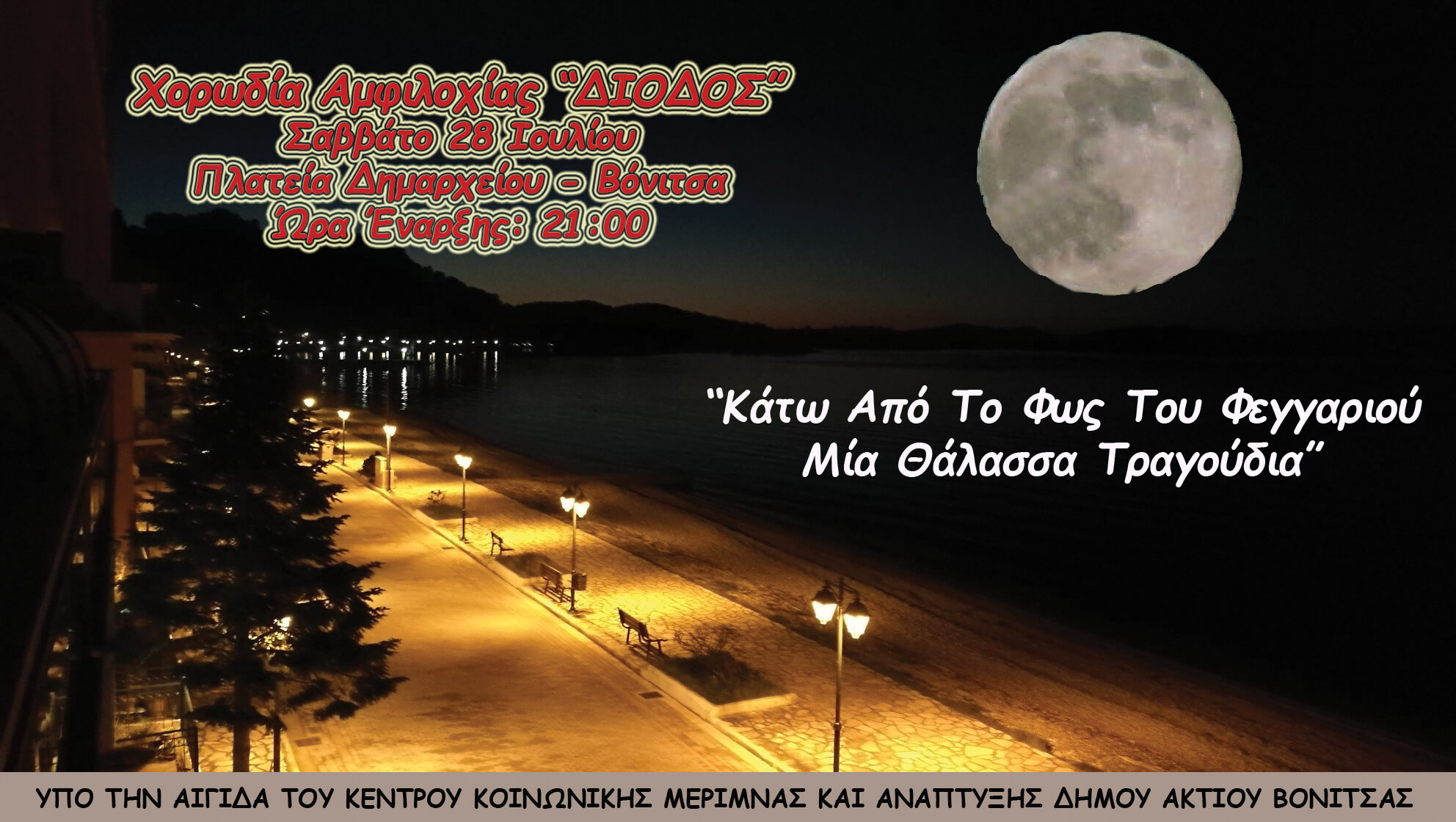 Το Σάββατο 28 Ιουλίου στην παραλία της Βόνιτσας η Χορωδία της «ΑΜΦΙΛΟΧΙΑΣ ΔΙΟΔΟΣ» σε μια μουσική βραδιά αφιερωμένη στο Φεγγάρι και την θάλασσα.