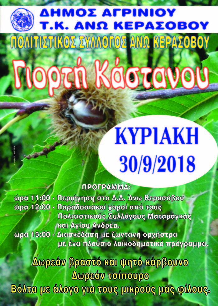 Ο Δήμος Αγρινίου σε συνεργασία με την Τοπική Κοινότητα στο Άνω Κεράσοβο διοργανώνει τη ΄΄Γιορτή Κάστανου΄΄ το Σάββατο 30 Σεπτεμβρίου 2018 στην πλατεία του Άνω Κερασόβου στις 7.00 μ.μ