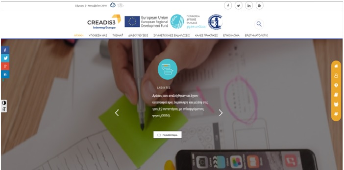 Το Περιφερειακό Ταμείο Ανάπτυξης της Περιφέρειας Δυτικής Ελλάδας στο πλαίσιο του ευρωπαϊκού έργου CREADIS3 – Interreg Europe (Smart Specialisation Creative Districts – Δημιουργικές Περιοχές έξυπνης εξειδίκευσης), με σκοπό να ενισχύσει την συμμετοχή όλων των ενδιαφερόμενων των Κλάδων Πολιτισμού και Δημιουργικότητας, δημιούργησε μια συμμετοχική, διαδικτυακή πλατφόρμα διαβούλευσης η οποία είναι προσβάσιμη μέσω της διεύθυνσης: www.creadis3ptapde.gr.