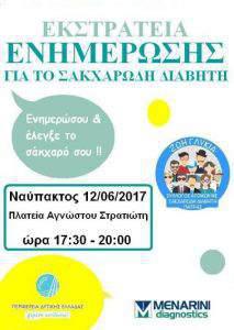 Η Διεύθυνση Δημόσιας Υγείας της Περιφέρειας Δυτικής Ελλάδας σε συνεργασία με τον Σύλλογο Διαβητικών «ΓΛΥΚΙΑ ΖΩΗ», οργανώνουν από την ερχόμενη Δευτέρα 12 Ιουνίου, μία εβδομάδα ενημέρωσης και προληπτικών εξετάσεων για τον σακχαρώδη διαβήτη.