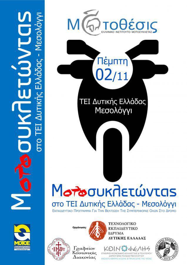 Το Τ.Ε.Ι. Δυτικής Ελλάδας, το Γραφείο Κοινωνικής Διακονίας της Ιεράς Μητροπόλεως Αιτωλίας και Ακαρνανίας, το Ανοικτό Κέντρο Αγωγής & Προαγωγής της Υγείας της Κοινωφελούς Επιχείρησης του Δήμου Ιεράς Πόλεως Μεσολογγίου και η Μοτολέσχη Ιεράς Πόλεως Μεσολογγίου συνδιοργανώνουν με το Ελληνικό Ινστιτούτο Μοτοσυκλέτας «MOTOΘΕΣΙΣ» στο Τ.Ε.Ι. Δυτ. Ελλάδας, στο Μεσολόγγι, την Πέμπτη 2 Νοεμβρίου 2017 από τις 10:00 έως τις 13:00, σειρά Ενημερωτικών και Εκπαιδευτικών Δραστηριοτήτων για τα μέλη της Ακαδημαϊκής κοινότητας του Τ.Ε.Ι. και κάθε ενδιαφερόμενο, που αφορούν στην οδήγηση της μοτοσυκλέτας και την βελτίωση της συμπεριφοράς όλων στο δρόμο.
