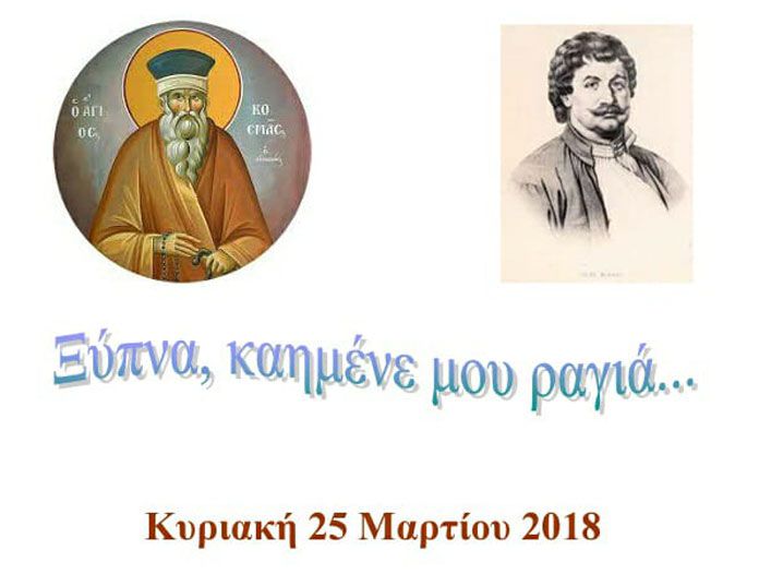 Ο Πολιτιστικός Σύλλογος Παναιτωλίου «Χρήστος Καπράλος» προσκαλεί στην εκδήλωση «Ξύπνα, καημένε μου ραγιά…», την Κυριακή 25 Μαρτίου και ώρα 19.30, στην αίθουσα εκδηλώσεων της Κοινότητας Παναιτωλίου. Θα παρουσιαστεί ένα αφιέρωμα στον ιερομάρτυρα, ισαπόστολο και εθνεγέρτη Πατροκοσμά και στον πρόδρομο και πρωτομάρτυρα της ελευθερίας Ρήγα Φεραίο.