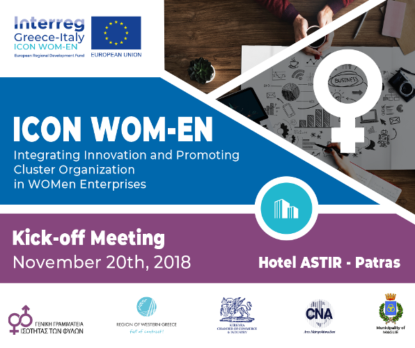 Η χαρτογράφηση της επιχειρηματικότητας των γυναικών και η καταγραφή των προβλημάτων των επιχειρηματιών και των δυνητικών επιχειρηματιών (συμπεριλαμβανομένης της σεξουαλικής παρενόχλησης, των διοικητικών προβλημάτων, της έλλειψης επιχειρηματικής εκπαίδευσης, των τοπικών κοινωνικών περιορισμών κ.λπ.), είναι το αντικείμενο του ευρωπαϊκού έργου με τίτλο «ICON WOM–EN», στο οποίο συμμετέχει η Περιφέρεια Δυτικής Ελλάδας.