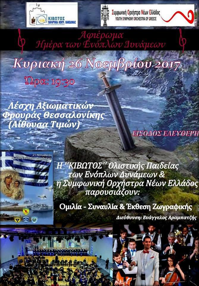 Η Συμφωνική Ορχήστρα Νέων Ελλάδος θα εμφανιστεί την Κυριακή 26 Νοεμβρίου 2017 και ώρα 19.30, στην Λέσχη Αξιωματικών Φρουράς Θεσσαλονίκης με ΕΛΕΥΘΕΡΗ ΕΙΣΟΔΟ για το κοινό, στα πλαίσια της Ημέρας Εορτής των Ενόπλων Δυνάμεων.