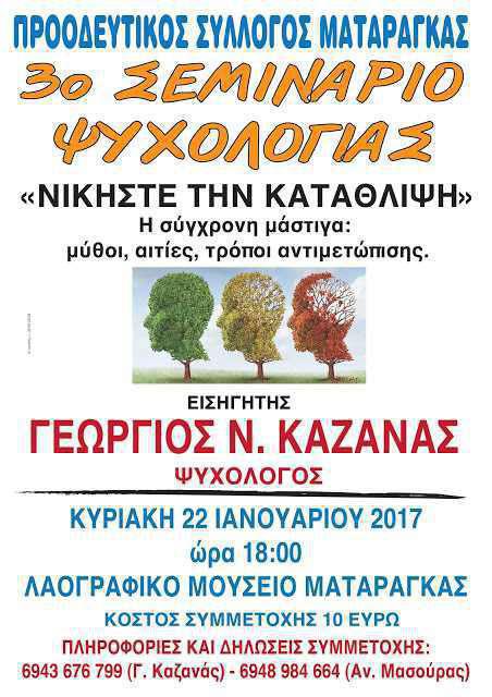 Ο Προοδευτικός Σύλλογος Ματαράγκας διοργανώνει το 3ο Σεμινάριο Ψυχολογίας με τίτλο “Νικήστε την Κατάθλιψη”.Το σεμινάριο θα πραγματοποιηθεί στον χώρο του Λαογραφικού Μουσείου Ματαράγκας.