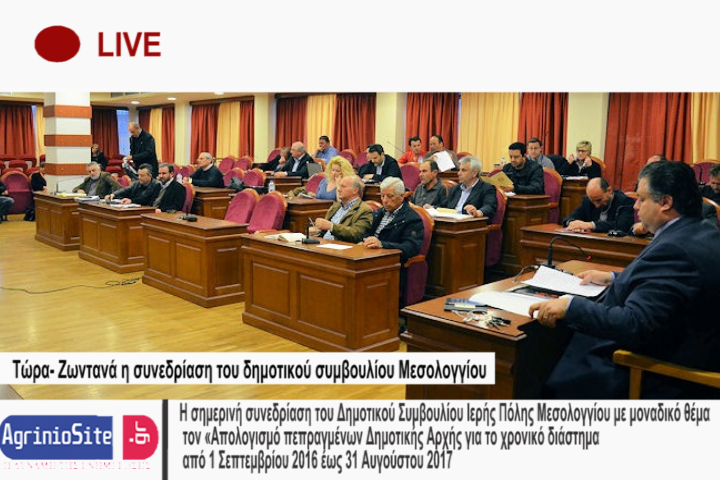 Η σημερινή συνεδρίαση του Δημοτικού Συμβουλίου Ιερής Πόλης Μεσολογγίου με μοναδικό θέμα τον «Απολογισμό πεπραγμένων Δημοτικής Αρχής για το χρονικό διάστημα από 1 Σεπτεμβρίου 2016 έως 31 Αυγούστου 2017, σε ότι αφορά την οικονομική κατάσταση, τη διοίκηση του Δήμου και την εφαρμογή του προγράμματος δημοτικής δράσης». Σημειώνεται πως η συνεδρίαση πραγματοποιείται στη νέα αίθουσα του Δημαρχείου Ιερής Πόλης Μεσολογγίου (2ος όροφος) ώρα 5.30 μ.μ.