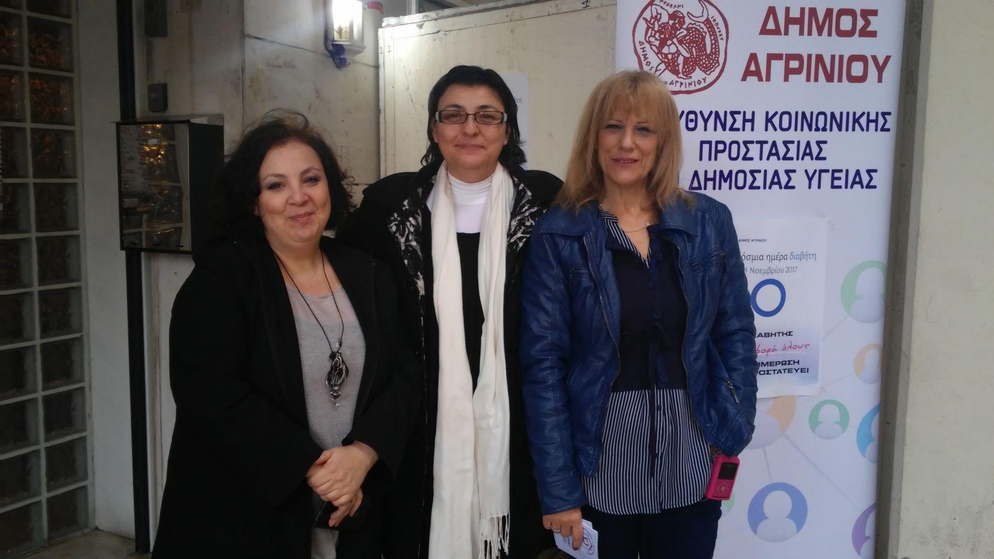 Στις μετρήσεις σακχάρου με στόχο την πρόληψη, την ενημέρωση και την ευαισθητοποίηση των πολιτών που πραγματοποιήθηκαν εχθές από το Δήμο Αγρινίου παρευρέθηκε και νεοσύστατος Σύλλογος Διαβητικών Αιτωλοακαρνανίας «Γλυκιά Ζωή». Ειδικότερα, το παρόν έδωσαν τα μέλη της προσωρινής διοικούσας επιτροπής: Σοφία Ζαμπάρα, πρόεδρος, Χριστίνα Νείλα αντιπρόεδρος και Αλέκα Αρτίκου οργανωτική γραμματέας.