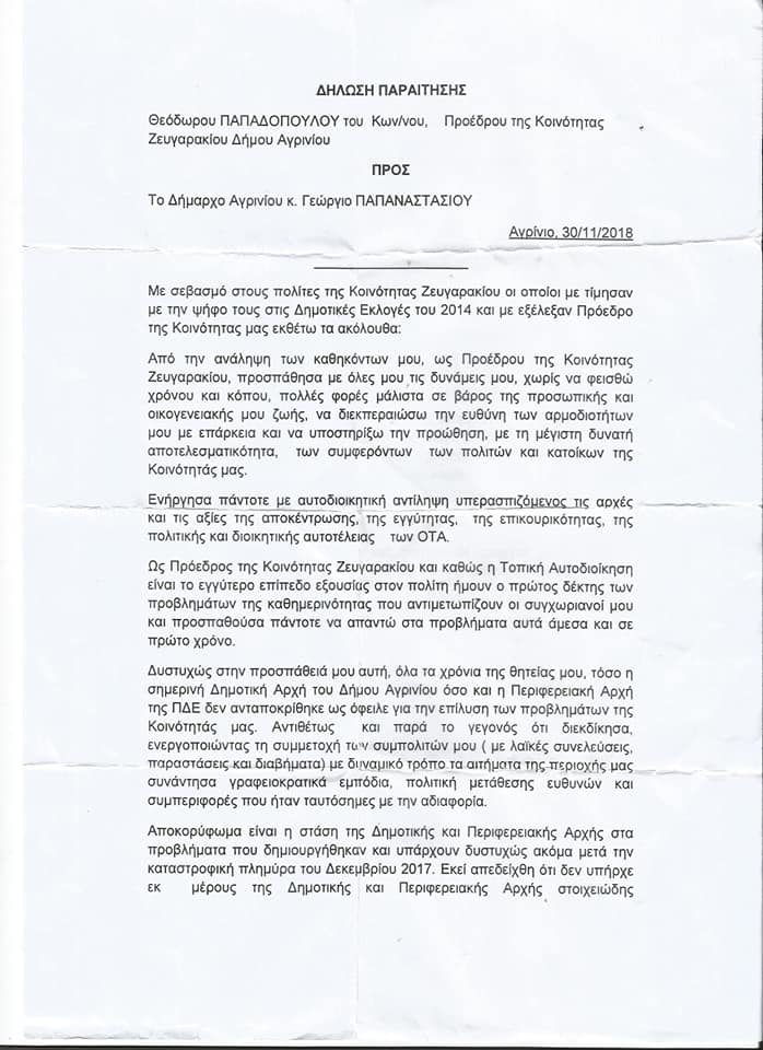 Την παραίτηση του υπέβαλε την περασμένη Παρασκευή  ο πρόεδρος της Τοπικής Κοινότητας Ζευγαρακίου ο κος Παπαδόπουλος Θεόδωρος στο δήμαρχο Αγρινίου, Γιώργο Παπαναστασίου, όπως είχε γράψει το  agriniosite.gr ΔΕΙΤΕ ΕΔΩ όμως σήμερα ανακοινώθηκαν οι λόγοι που τον οδήγησαν σε αυτή την παραίτηση.