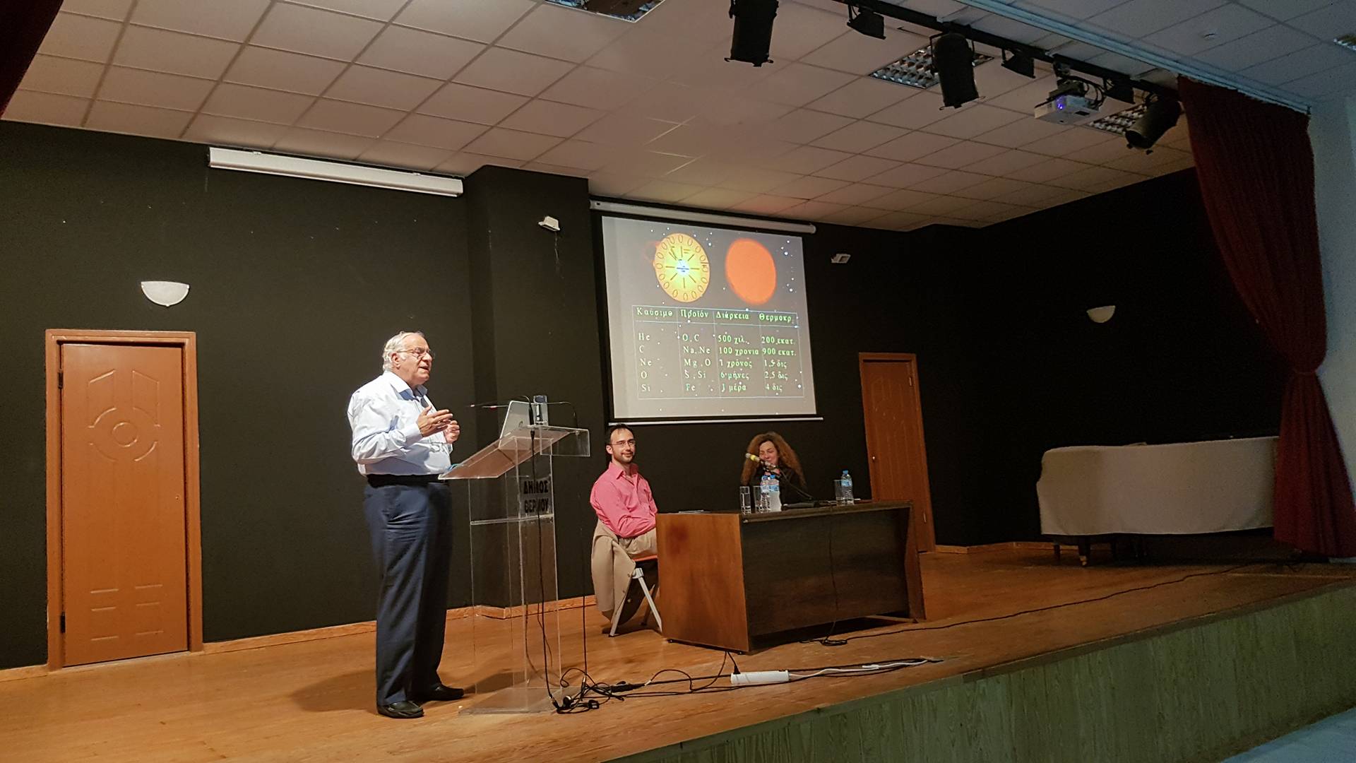 Την πρώτη μέρα στο Θέρμο, μετά την προλόγηση του κ. Νίκου Κωστακόπουλου από τον Δήμο Θέρμου, ο κ. Σιμόπουλος παρουσίασε τους μηχανισμούς κατά τους οποίους τα βαρύτερα ατομικά στοιχεία, πέραν του υδρογόνου, παράγονται στα κέντρα των αστέρων καθώς και γιατί είμαστε όλοι αστρόσκονη! Η προσέλευση του κόσμου ήταν μεγάλη με εύστοχες και ποιοτικές ερωτήσεις.