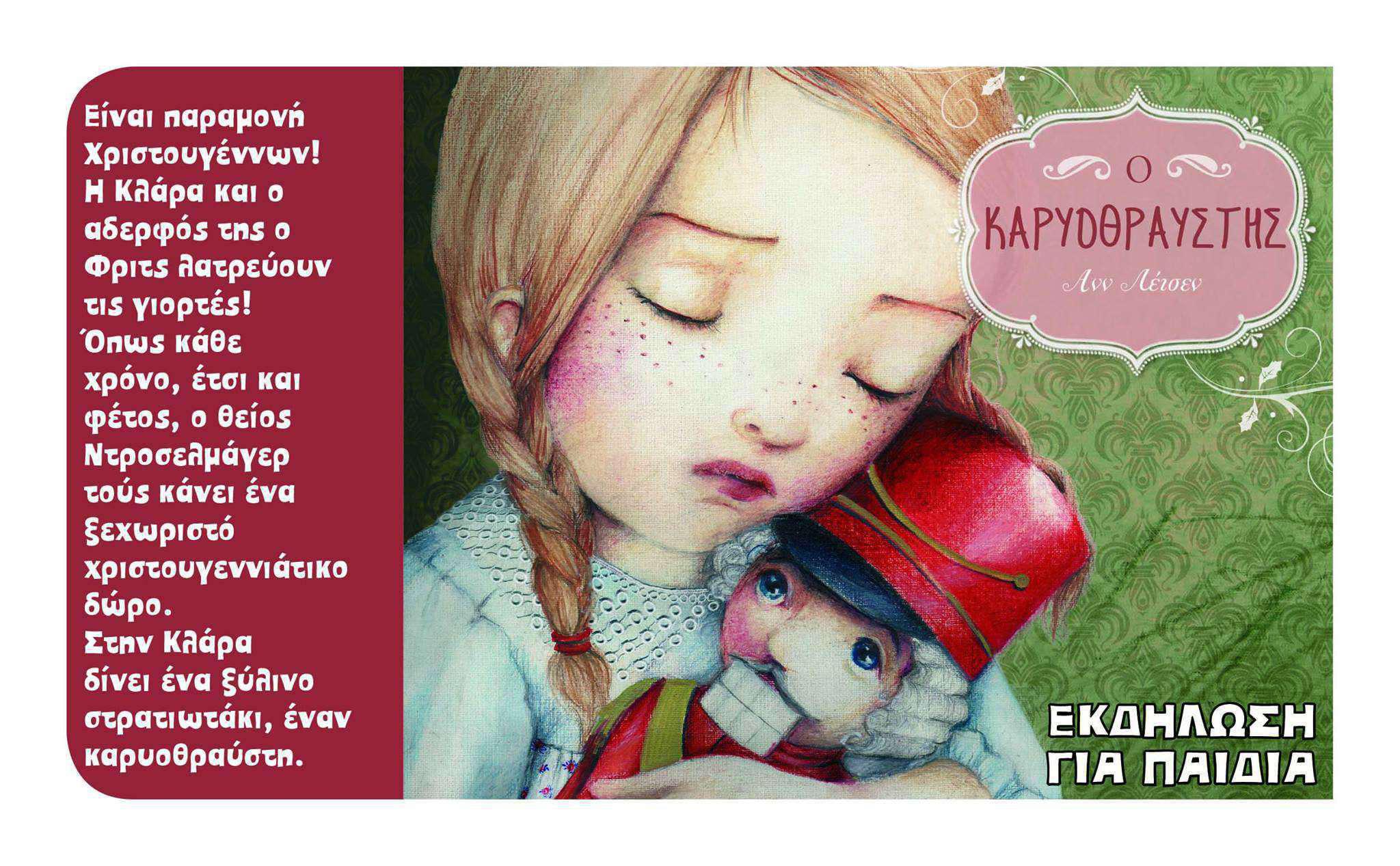 Το βιβλιοπωλείο Βιβλιοτρόπιο και οι εκδόσεις Μεταίχμιο προσκαλούν τους μικρούς τους φίλους σε εκδήλωση με αφορμή το βιβλίο της Ανν Λέισεν Ο ΚΑΡΥΟΘΡΑΥΣΤΗΣ το Σάββατο, 17 Δεκεμβρίου 2016, στις 12 το μεσημέρι στο χώρο του βιβλιοπωλείου (Καζαντζή 25, Αγρίνιο)