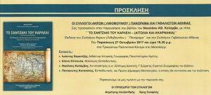 Οι σύλλογοι Άκρων (Λιθοβουνίου) «Πανόραμα» και Γαβαλιωτών Αθήνας προσκαλούν στην παρουσίαση του βιβλίου του Νικόλαου Αθ. Κολόμβα, με τίτλο «Το Σαντζάκι του Κάρλελι – (Αιτωλία και Ακαρνανία)» την Παρασκευή 27 Οκτωβρίου 2017 και ώρα 18:30 στο Τρικούπειο Πολιτιστικό Κέντρο στο Μεσολόγγι.