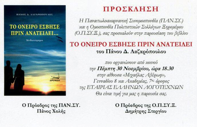 Η Παναιτωλοακαρνανική Συνομοσπονδία (ΠΑΝ.ΣΥ) και η Ομοσπονδία Πολιτιστικών Συλλόγων Ξηρομέρου (Ο.Π.ΣΥ.Ξ), σας προσκαλούν στην παρουσίαση του βιβλίου «Το όνειρο έσβησε πριν ανατείλει» του Πάνου Δ. Λαζαρόπουλου, που οργανώνουν από κοινού την Πέμπτη 30 Νοεμβρίου, ώρα 06:30 μ.μ., στην αίθουσα «Μιχαήλας Αβέρωφ», Γενναδίου 8 και Ακαδημίας, 7ος όροφος της ΕΤΑΙΡΙΑΣ ΕΛΛΗΝΩΝ ΛΟΓΟΤΕΧΝΩΝ.