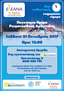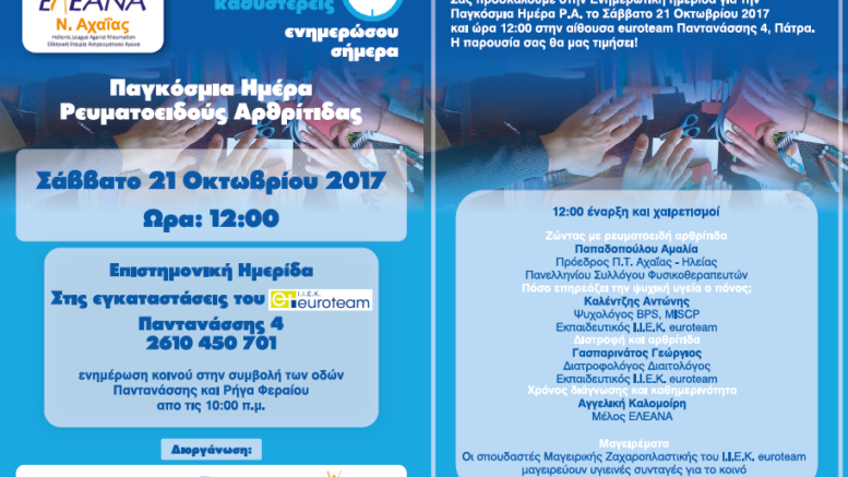 Η Περιφέρεια Δυτικής Ελλάδας σε συνεργασία με την Ελληνική Εταιρεία Αντιρευματικού Αγώνα «ΕΛΕΑΝΑ» Ν. Αχαΐας με αφορμή τον εορτασμό για την Παγκόσμια Ημέρα Ρευματοειδούς Αρθρίτιδας οργανώνουν το Σάββατο 21 Οκτωβρίου και ώρα 10:00-12:30 διαδραστική ενημέρωση των πολιτών για τα ρευματοειδή νοσήματα και την σωστή διατροφή στον πεζόδρομο της Ρήγα Φεραίου, στην συμβολή με την Παντανάσσης, από εξειδικευμένους ιατρούς και στελέχη του συλλόγου «ΕΛΕΑΝΑ».