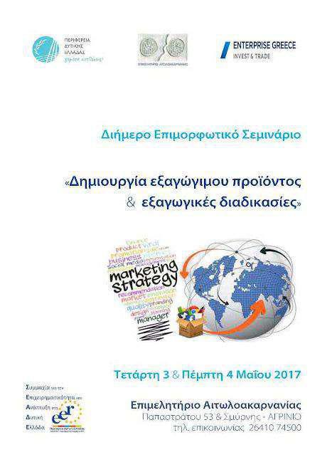Το Επιμελητήριο Αιτωλοακαρνανίας ενημερώνει τα μέλη του ότι σε συνεργασία με την Περιφέρεια Δυτικής Ελλάδος και τον Οργανισμό «Enterprise Greece» διοργανώνουν Διήμερο Επιμορφωτικό Σεμινάριο με θέμα: