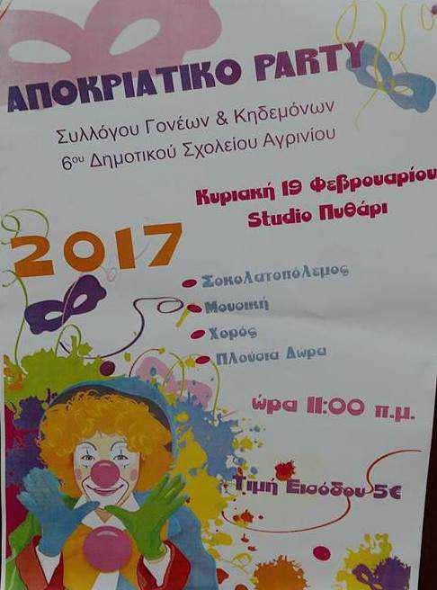 Ο Σύλλογος Γονέων & Κηδεμόνων του 6ου Δημοτικού Σχολείου Αγρινίου διοργανώνει  το αποκριάτικο πάρτυ του….