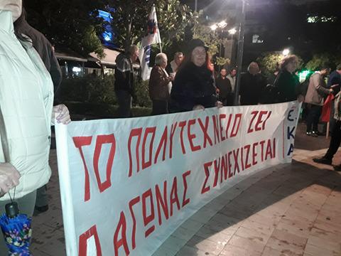 “Η επέτειος του Πολυτεχνείου, η πάλη του λαού και της νεολαίας, δίνουν ένα ακόμη ηχηρό μήνυμα ενάντια στο φασισμό και είναι χρέος στη μνήμη όλων όσων έδωσαν τη ζωή τους και αγωνίστηκαν για ένα καλύτερο αύριο να καταδικάσουν και ν’ απομονώσουν ακόμα πιο αποφασιστικά τη ναζιστική Χρυσή Αυγή, που υμνεί τη στρατιωτική δικτατορία και συκοφαντεί την, αντιδικτατορική πάλη του λαού και της νεολαίας. Δεν θα τους κάνουμε τη χάρη να γονατίσουμε. Είμαστε μπολιασμένοι με τα μηνύματα του ΠολυτεχνείουΤιμάμε τον ανυποχώρητο αγώνα, την ηρωική εξέγερση του Πολυτεχνείου” τονίστηκε στην συγκέντρωση.