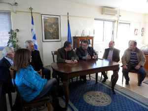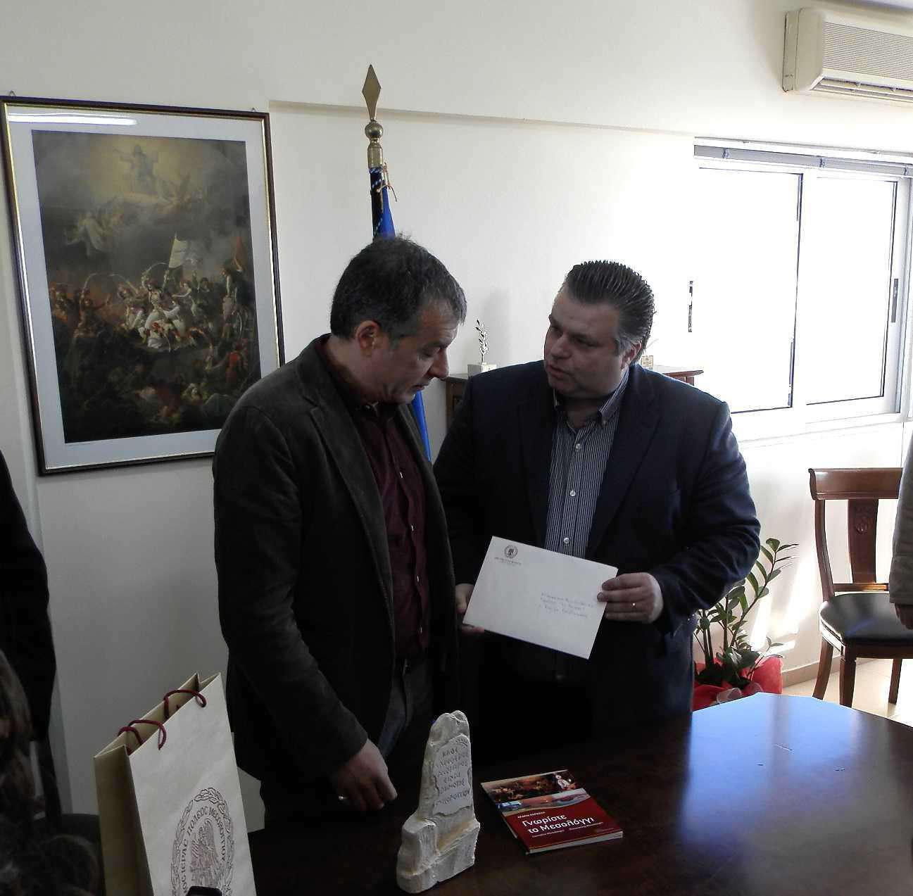 Μετά την ολοκλήρωση της συζήτησης, ο δήμαρχος Ιερής Πόλης Μεσολογγίου επέδωσε αναμνηστικό προς τον κ. Θεοδωράκη, καθώς επίσης προσωπική πρόσκληση για τις Εορτές Εξόδου.