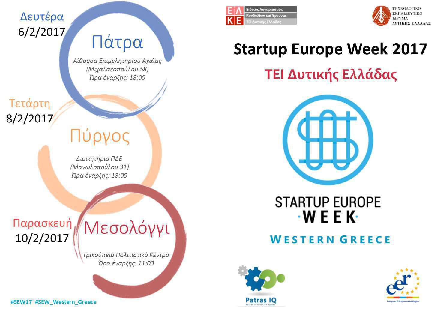 • Το ΤΕΙ Δυτικής Ελλάδας ανακοινώνει τη διεξαγωγή της Εβδομάδας Επιχειρηματικότητας Startup Europe Week (#SEW17) για πρώτη φορά στη Δυτική Ελλάδα το διάστημα 6 έως 10 Φεβρουαρίου 2017.