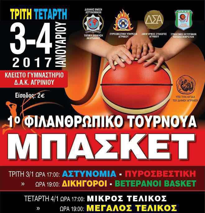 H τοπική διοίκηση Ακαρνανίας, της Διεθνούς Ένωσης Αστυνομικών, διοργανώνει, για 5η χρονιά, φιλανθρωπική εκδήλωση αγώνων μπάσκετ, με συμμετοχή τεσσάρων ομάδων του Αγρινίου, των αστυνομικών, των πυροσβεστών, των δικηγόρων και των βετεράνων μπάσκετ Αγρινίου.