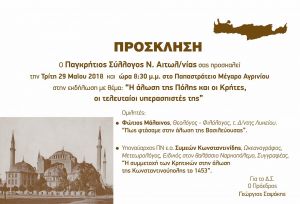 Ο Παγκρήτιος Σύλλογος Ν. Αιτωλ/νίας σας προσκαλεί την Τρίτη 29 Μαΐου 2018 και ώρα 8:30 μ.μ. στο Παπαστράτειο Μέγαρο Αγρινίου στην εκδήλωση με θέμα: «Η άλωση της Πόλης και οι Κρήτες, οι τελευταίοι υπερασπιστές της».