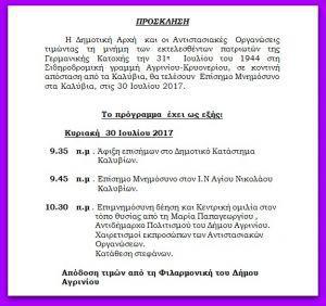 Επίσημο μνημόσυνο, προς τιμή της μαρτυρικής εκτέλεσης των 59 Ελλήνων πατριωτών, οι οποίοι, το πρωινό της Δευτέρας 31 Ιουλίου 1944, μεταφέρθηκαν στα Καλύβια, από τις φυλακές των αποθηκών Παναγόπουλου και…της Αγίας Τριάδας Αγρινίου, για να εκτελεσθούν από τις γερμανικές δυνάμεις κατοχής, θα τελεστεί, την Κυριακή 30 Ιουλίου 2017, από το Δήμο Αγρινίου και τις Αντιστασιακές Οργανώσεις.