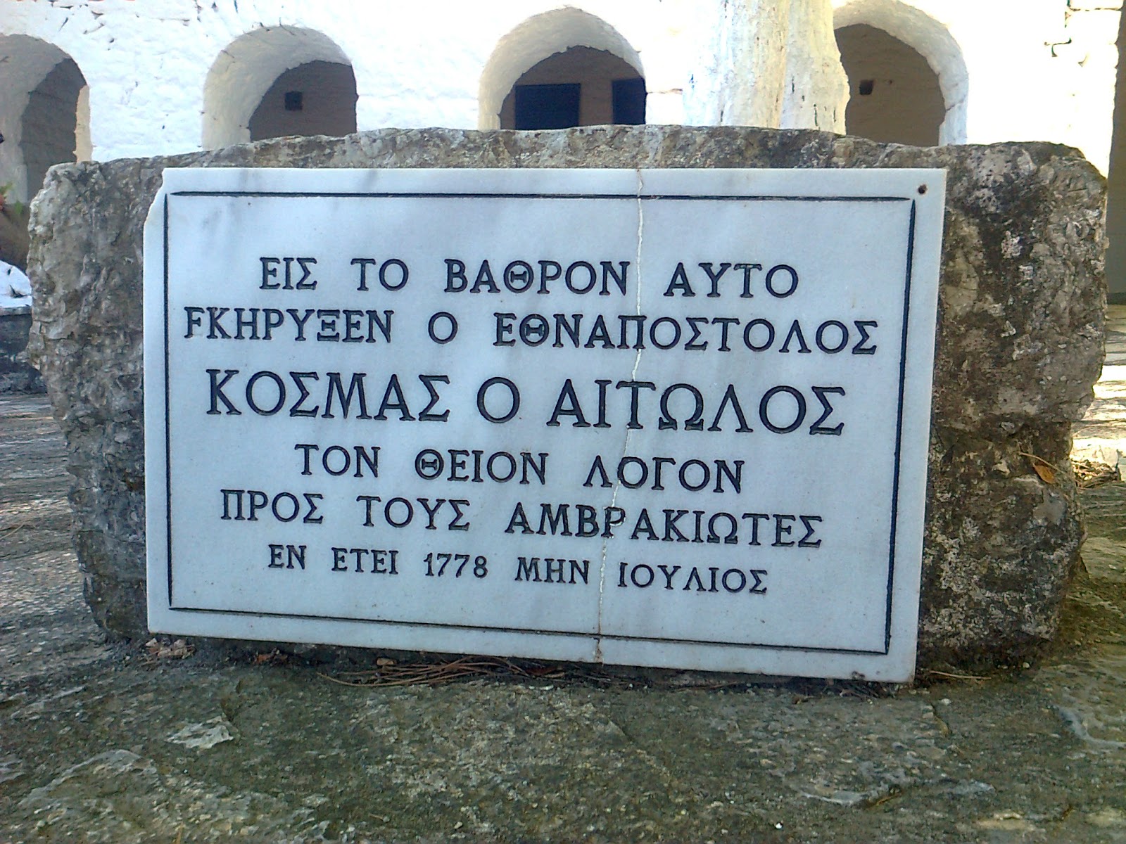 Στο προαύλιο του Ναού, τον Ιούλιο του 1778, κήρυξε το Θείο λόγο στους Αμβρακιώτες  ο εθνομάρτυρας και εθναπόστολος Κοσμάς ο Αιτωλός (ο ΠατροΚοσμάς), στεκούμενος πάνω σε ένα πέτρινο βάθρο!