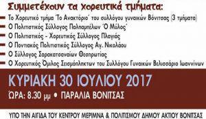 Κυριακή 30/07/2017 στην πλατεία Δημαρχείου της Βόνιτσας, όπου θα παρουσιαστούν παραδοσιακοί χοροί από όλη την Ελλάδα, στο πλαίσιο διοργάνωσης των Πολιτιστικών εκδηλώσεων.