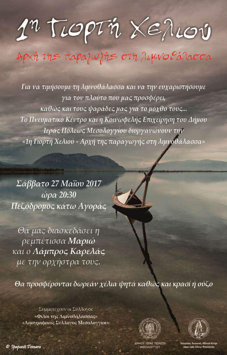 - Στους ανθρώπους και την αρχή της αλιευτικής παραγωγής της λιμνοθάλασσας είναι αφιερωμένη η 1η Γιορτή Χελιού που διοργανώνει ο Δήμος Ιερής Πόλης Μεσολογγίου το Σάββατο 27 Μαΐου.