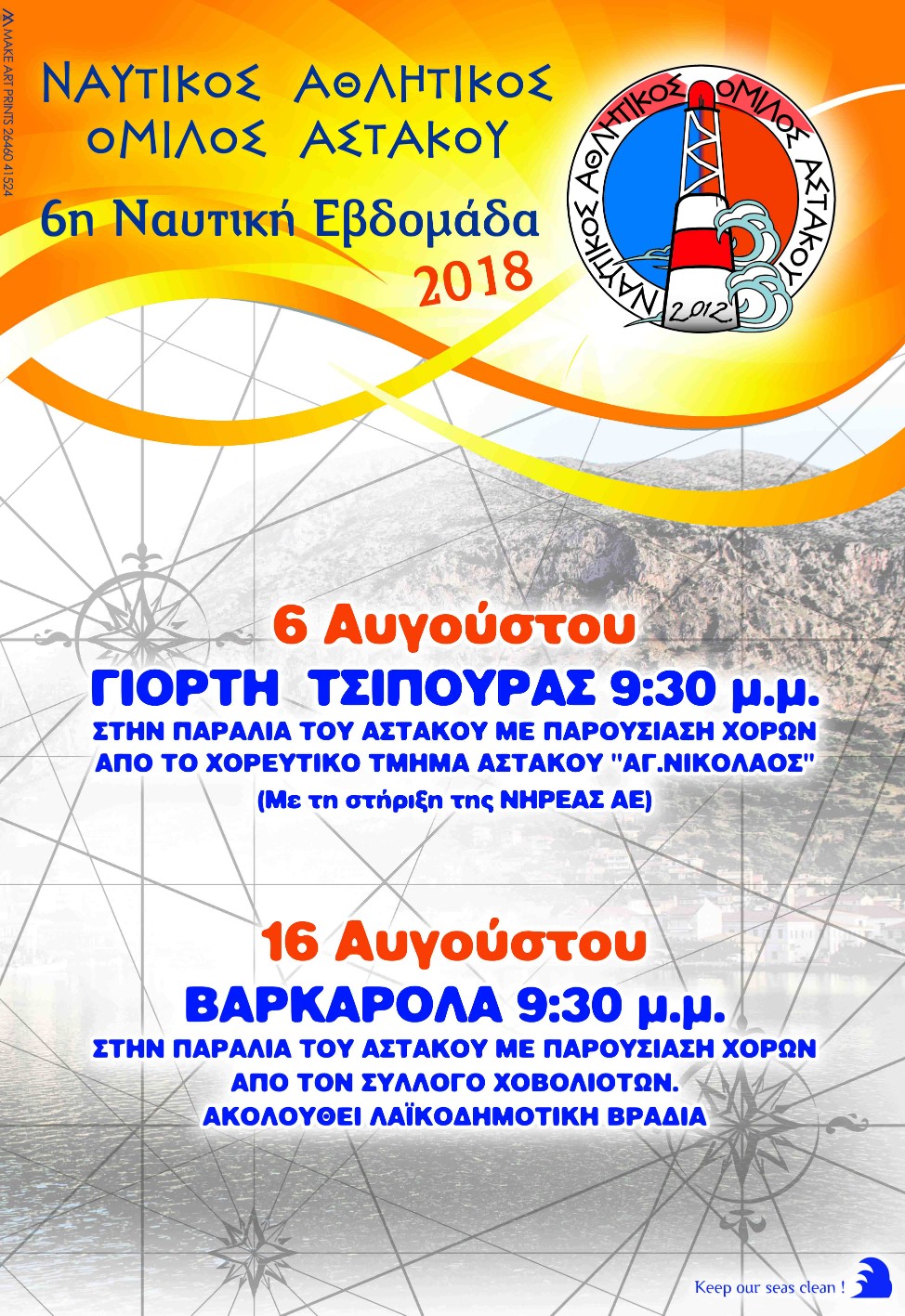 Ο Ναυτικός Αθλητικός Όμιλος Αστακού διοργανώνει την 6η Ναυτική Εβδομάδα στον Αστακό με Γιορτή Τσιπούρας και Βαρκαλόλα…Με την στήριξη της εταιρίας, ΝΗΡΕΑΣ ΑΕ,