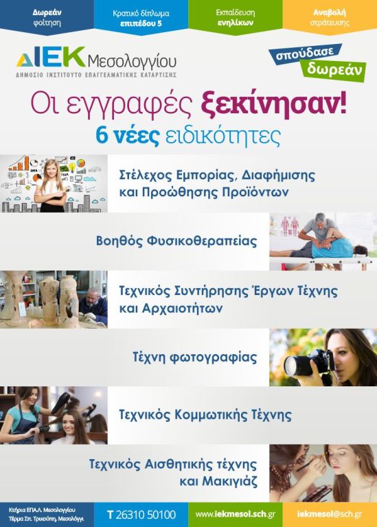 Στο Δ.ΙΕΚ Μεσολογγίου, οι ενδιαφερόμενοι μπορούν να εγγραφούν σε 6 νέες ειδικότητες.