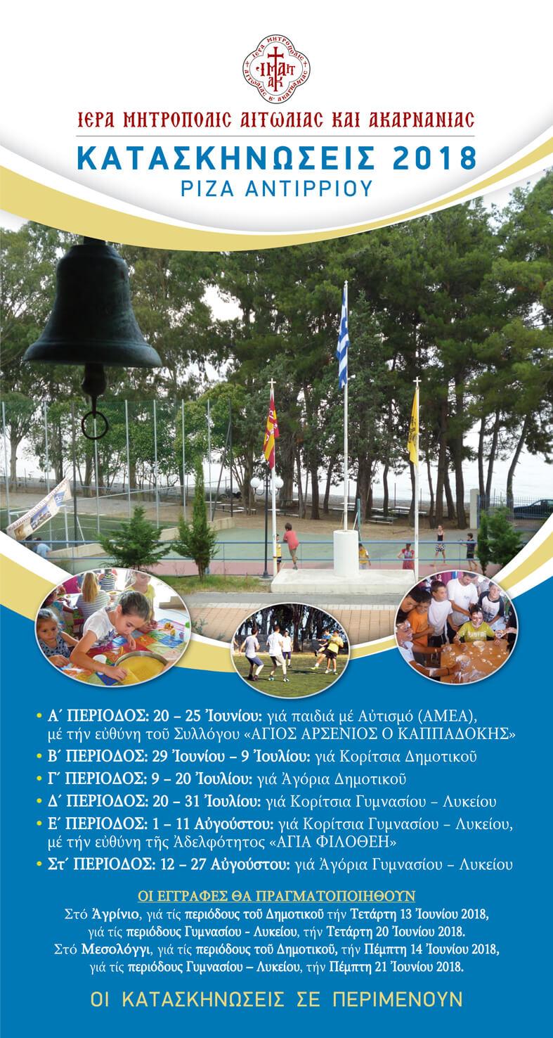 Με τη Χάρη του Θεού και την ευλογία του Σεβασμιωτάτου Ποιμενάρχου μας, Μητροπολίτου Αιτωλίας και Ακαρνανίας κ. Κοσμά, θα λειτουργήσουν εφέτος οι Κατασκηνώσεις της Ιεράς Μητροπόλεως, στις παραθαλάσσιες εγκαταστάσεις της περιοχής Ρίζα Αντιρρίου.