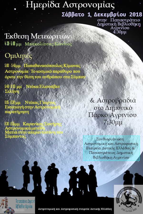 Η Παπαστράτειος Δημοτική Βιβλιοθήκη Αγρινίου και η Αστρονομική και Αστροφυσική Εταιρεία Δυτικής Ελλάδας, συνδιοργανώνουν την 1η Δεκεμβρίου 2018, ημέρα Σάββατο, στις 4:30μμ ημερίδα με παρουσιάσεις – ομιλίες σχετικά με την Αστρονομία. Πριν τις ομιλίες στις 4:30μμ θα γίνει παρουσίαση Έκθεσης 40 γνήσιων Μετεωριτών από όλον τον κόσμο, από τον Αντιπρόεδρο της Αστρονομικής και Αστροφυσικής Εταιρείας Δυτικής Ελλάδας Μπακολίτσα Κωνσταντίνο.