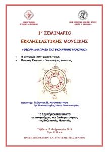 Το Σεμινάριο, με θέμα «Θεωρία και Πράξη της Βυζαντινής Μουσικής»,  το παρακολούθησαν πτυχιούχοι και διπλωματούχοι της βυζαντινής μουσικής και διεξήχθη στο χώρο του Πνευματικού Κέντρου του Ιερού Παρεκκλησίου της Ευαγγελιστρίας, στο Αγρίνιο.