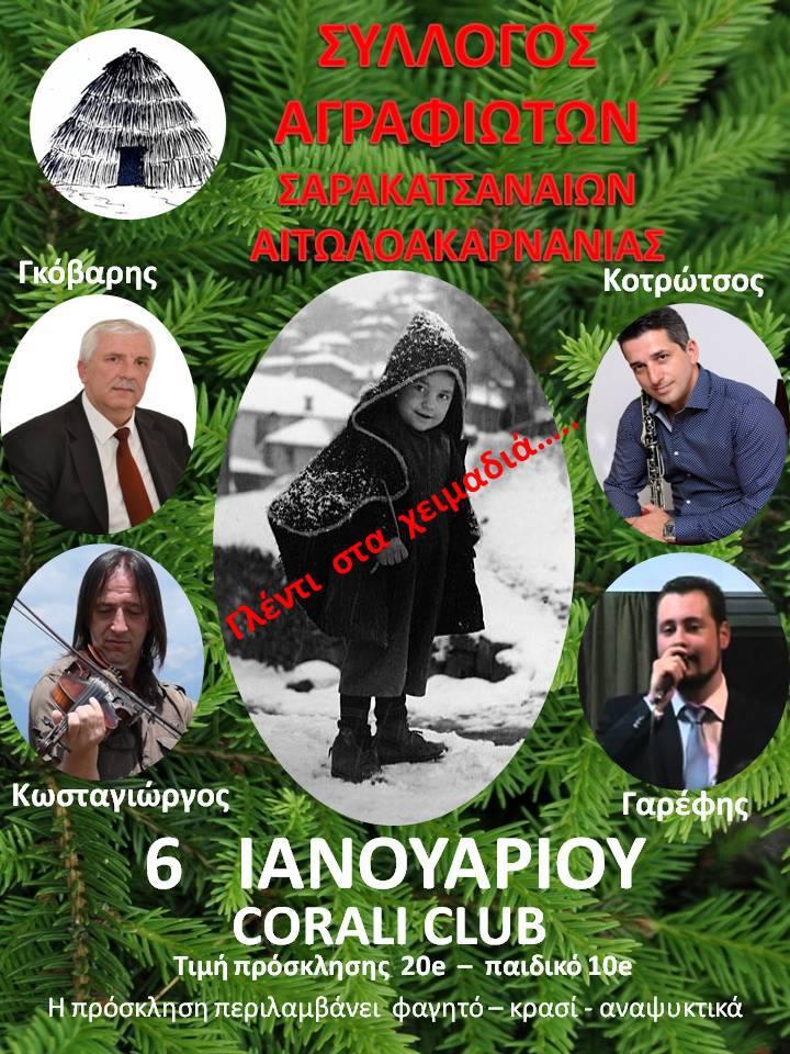 Ο Σύλλογος Αγραφιωτών Σαρακατσαναίων διοργανώνει το ετήσιο «Γλέντι στα χειμαδιά» το Σάββατο 6 Ιανουαρίου 2018 στο CORALI CLUB  και καλεί  όλους για γλέντι  με Σαρακατσάνικη μουσική και τραγούδια.Κ ατα την διάρκεια της εκδήλωσης θα χορέψουν τα τμήματα του συλλόγου με τους ήχους γνήσιας Σαρακατσάνικης ορχήστρας(Τραγούδι: Γιάννης Γκοβαρης Κώστας Γαρέφης κλαρίνο Πάνος κοτρωτσος. Βιολί Κώστας Κωσταγιωργος).