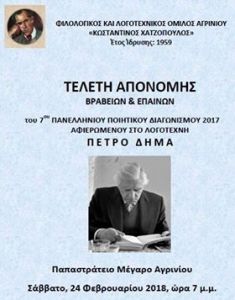 Σάββατο, 24 Φεβρουαρίου 2018, Παπαστράτειο Μέγαρο Αγρινίου(ώρα 07.00 μ.μ.):Τελετή Απονομής Βραβείων-Επαίνων