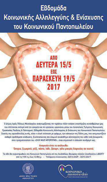 Υπενθυμίζεται στους συνδημότες μας πως ξεκινά τη Δευτέρα 15 Μαΐου και θα ολοκληρωθεί την Παρασκευή 19/5, η εβδομάδα δράσης και πρωτοβουλίας που διοργανώνει ο Δήμος Ιερής Πόλης Μεσολογγίου μέσω του Αυτοτελούς Τμήματος Κοινωνικής Προστασίας Παιδείας και Πολιτισμού, η οποία έχει ως στόχο την συγκέντρωση τροφίμων προς ενίσχυση της δομής του Κοινωνικού Παντοπωλείου.