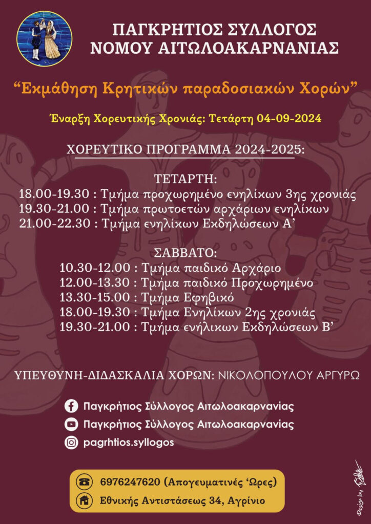 Τη Τετάρτη 04-09-2024 ξεκινούν τα μαθήματα εκμάθησης κρητικών χορών στον παγκρήτιο σύλλογο Νομού Αιτωλοακαρνανίας.
