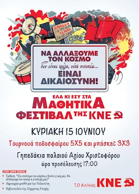 Με το σύνθημα “Να αλλάξουμε τον κόσμο δεν είναι τρέλα, ούτε ουτοπία… Είναι δικαιοσύνη!”, διεξάγεται το φετινό μαθητικό φεστιβάλ ΚΝΕ στο Αγρίνιο. Φέτος θα πραγματοποιηθεί στα γήπεδα του Παλιού Αγίου Χριστοφόρου, τη Κυριακή 15 Ιουνίου, με ώρα προσέλευσης τις 17:00.